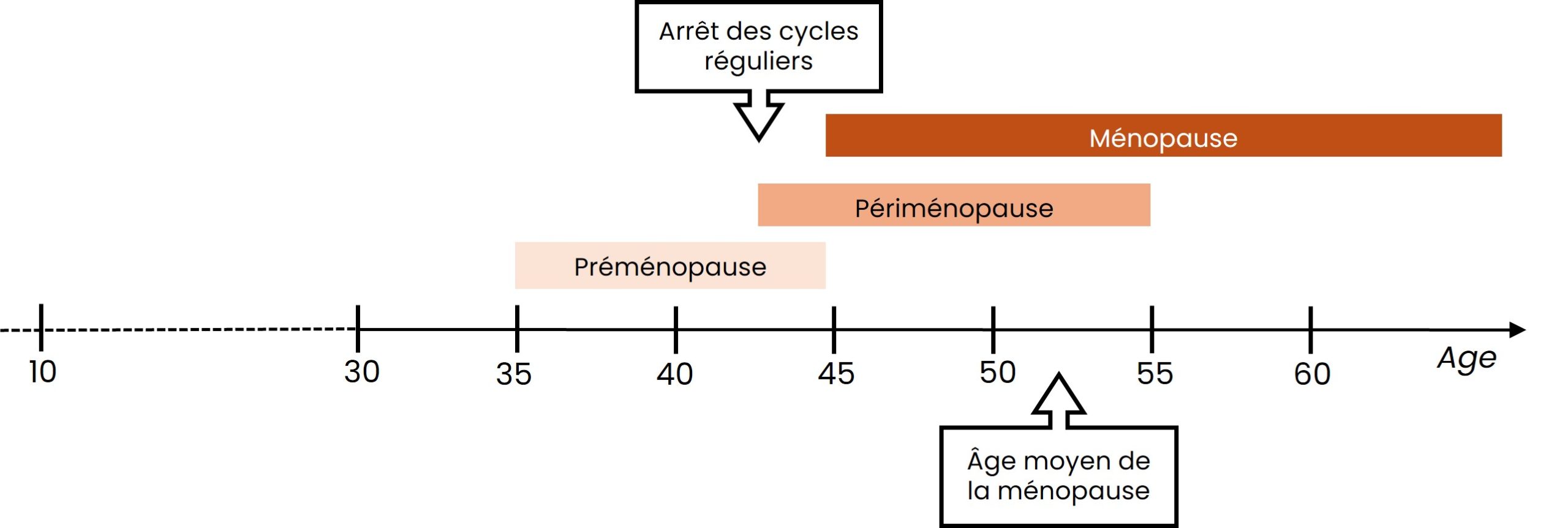 La ménopause est précédée par une période de transition, incluant la préménopause et la périménopause, qui a une durée variable de 2 à 10 ans en moyenne. La préménopause peut débuter dès l’âge de 35 ans.